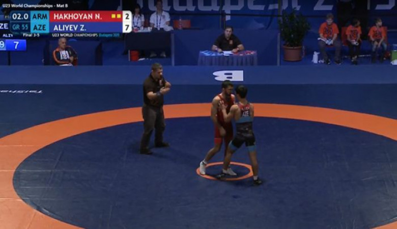 ՍպորտԲուդապեշտում ավարտին մոտեցող հունահռոմեական ըմբշամարտի աշխարհի մինչեւ 23 տարեկանների առաջնության 55 կգ քաշայինների բրոնզե մեդալի համար պայքարում Հայաստանի ներկայացուցիչ Նորայր Հախոյանը 2։7 հաշվով պարտվեց ադրբեջանցուն՝ վիճահարույց գոտեմարտում: