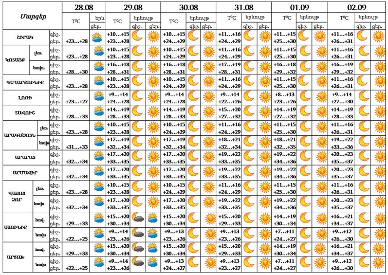 Երևան քաղաքում օգոստոսի 28-ի ցերեկը, 29-31-ը, սեպտեմբերի 1-2-ը սպասվում է առանց տեղումների եղանակ: