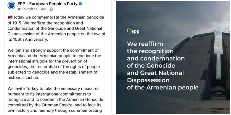 Եվրոպական ժողովրդական կուսակցությունը իր պաշտոնական ֆեյսբուքյան էջում անդրադարձել է Հայոց ցեղասպանության 106-րդ տարելոցին։