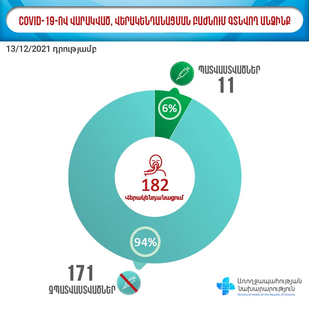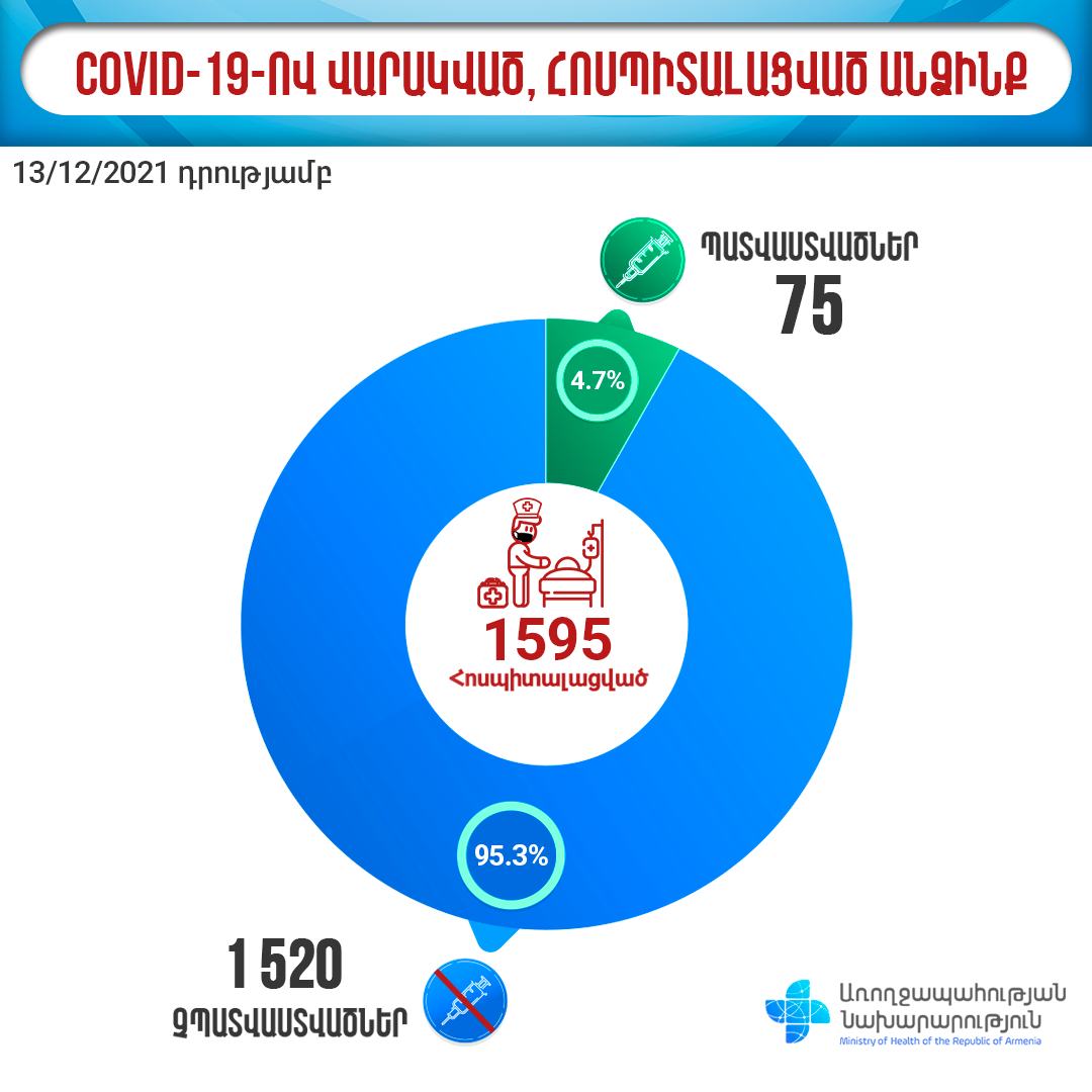 Ըստ այդմ՝ դեկտեմբերի 13-ի դրությամբ 7 266 դրական թեստավորվածների 94,6%-ը պատվաստված չէ, 1595 հոսպիտալացվածների 95,3%-ը պատվաստված չէ, 182 ինտենսիվ թերապիայի կարիք ունեցողների 94%-ը պատվաստված չէ: