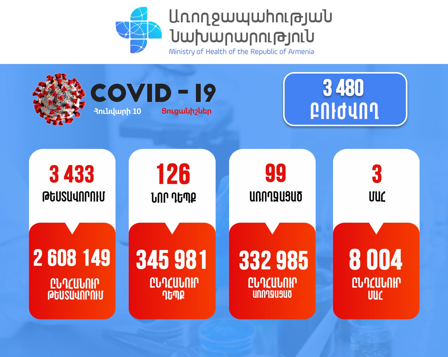 ՀասարակությունՀայաստանում հունվարի 10-ի ժամը 11:00-ի դրությամբ հաստատվել է կորոնավիրուսային հիվանդության ընդհանուր 345 հազար 981 դեպք, որից 332 հազար 985-ը`առողջացման, 8 004-ը` մահվան ելքով: