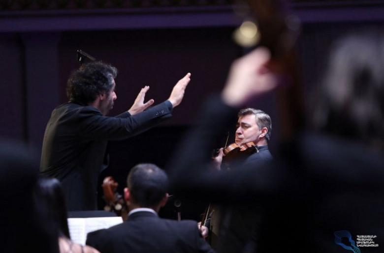Համերգային ծրագրում հնչեցին Կլոդ Դեբյուսիի «Ֆավնի հետկեսօրյա հանգիստը» պրելյուդը, Մորիս Ռավելի «Պավան հանգուցյալ արքայադստեր համար» ստեղծագործությունը, Ջակոմո Պուչչինիի Սիմֆոնիկ պրելյուդը։ Հայաստանի պետական սիմֆոնիկ նվագախմբի հետ և Սերգեյ Սմբատյանի ղեկավարությամբ ելույթ ունեցավ նաև Վահրամ Սարաջյանի մտերիմ բարեկամ Մաքսիմ Վենգերովը՝ կատարելով Ֆելիքս Մենդելսոնի Ջութակի կոնցերտը։