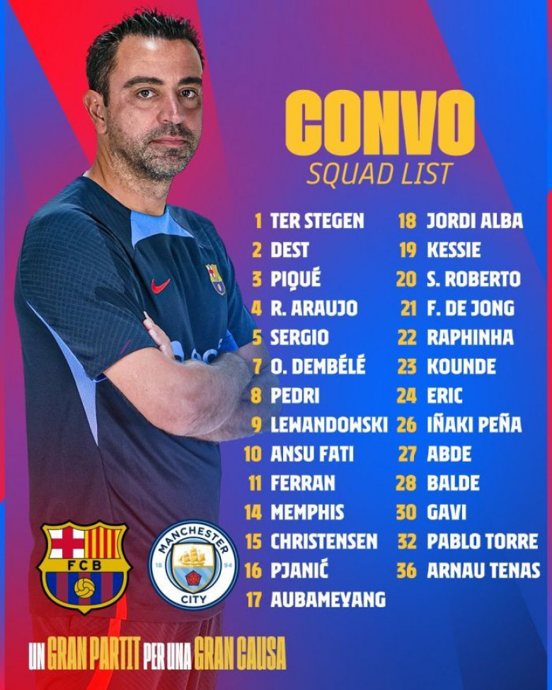 Իսպանիայի փոխչեմպիոն «Բարսելոնայի» գլխավոր մարզիչ Չավին հրապարակել է կազմը, որը կմասնակցի Անգլիայի չեմպիոն «Մանչեսթեր Սիթիի» դեմ ընկերական բարեգործական հանդիպմանը։