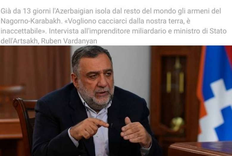 ՀարցազրույցԱրցախի պետական նախարար Ռուբեն Վարդանյանը հարցազրույց է տվել իտալական հեղինակավոր TEMPI պարբերականին՝ ներկայացնելով ադրբեջանական շրջափակման հետևանքով Արցախում ստեղծված իրավիճակը: Ինչպես տեղեկացրին Արցախի պետական նախարարի աշխատակազմից, նա ընդգծել է, որ իրավիճակը բարդ է, սակայն արցախահայությունը մտադիր չէ հանձնվել և շարունակելու է պաշտպանել սեփական հողում ապրելու իր իրավունքը:
