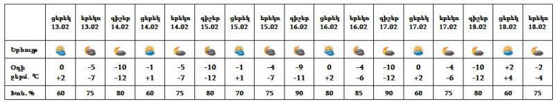 Փետրվարի 13-ի ցերեկը, 15-16-ն առանձին շրջաններում սպասվում է թույլ ձյուն։ Փետրվարի 14-ին և 17-18-ը սպասվում է առանց տեղումների եղանակ: