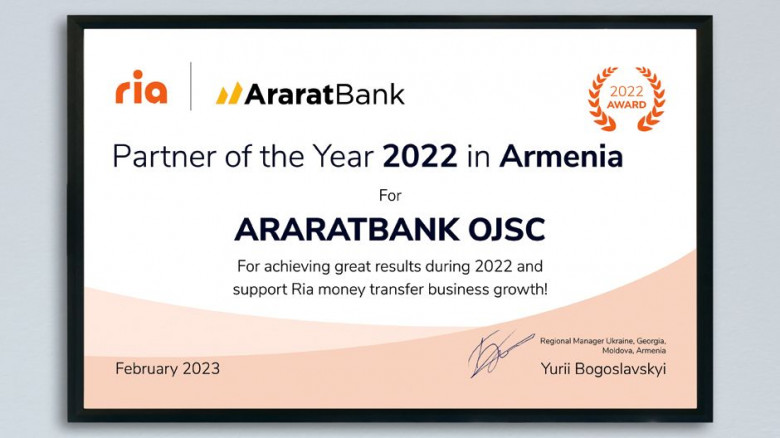 ՀասարակությունRia Money Transfer համակարգն ԱրարատԲանկին հերթական անգամ արժանացրել է 2022թ․ «Տարվա գործընկեր» մրցանակին։