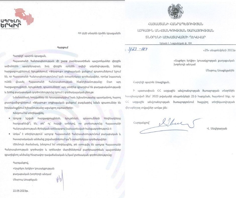 Շաբաթներ առաջ դիմել էի ԱԱԾ, թե արդյոք Հայաստանի Հանրապետությունում քաղաքական և հասարակական անձանց շրջանակներում կան օտարերկրյա գործակալներ՝ հաշվի առնելով, որ իշխանություններն անդադար նշում են, որ Հայաստանում կան օտարերկրյա գործակալներ։