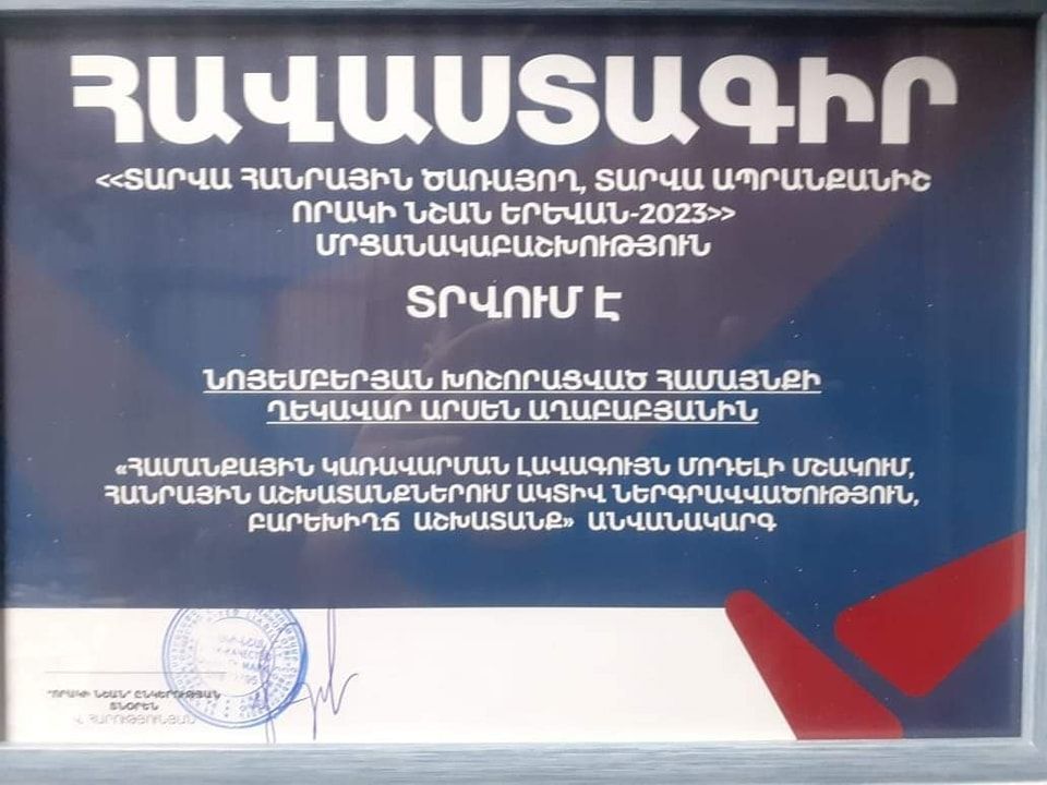 ՔաղաքականԵվս մեկ կարևոր գնահատական մեր թիմի արած աշխատանքին Նոյեմբերյան համայնքում․ այստեղ համայնքի ղեկավար, «Ապրելու երկիր» կուսակցության քաղաքական խորհրդի անդամ Արսեն Աղաբաբյանն արժանացել է մրցանակի «Համայնքային կառավարման լավագույն մոդելի մշակում, հանրային աշխատանքներում ակտիվ ներգրավվածություն, բարեխիղճ աշխատանք» անվանակարգում «Տարվա հանրային ծառայող, տարվա ապրանքանիշ որակի նշան Երևան 2023» մրցանակաբաշխության ժամանակ։