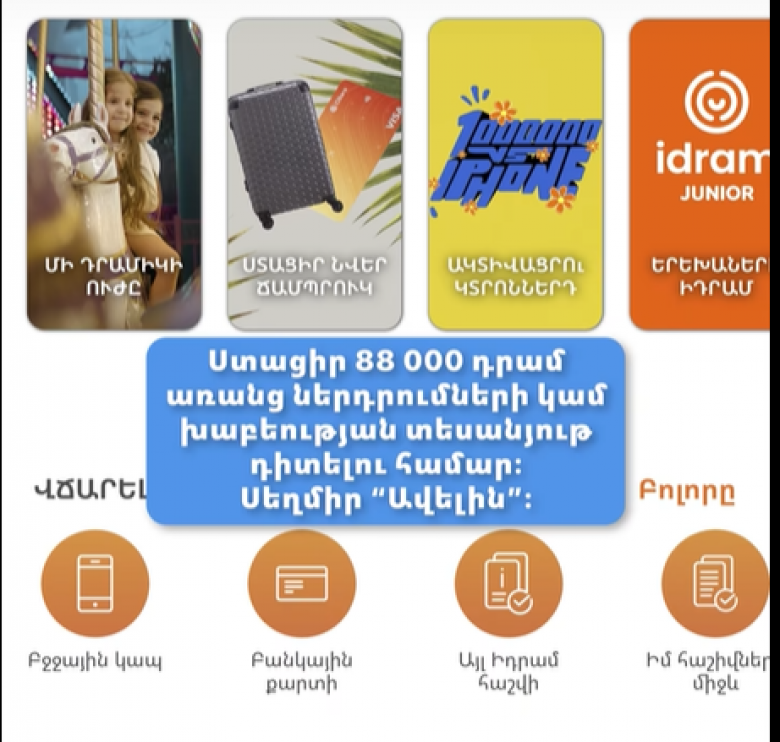 Հաջորդ օրինակն ենք ցույց տալիս։ Ախր այստեղ անգամ Idram&IDBank հավելվածի տեսքն է հին, մենք մեր հավելվածը վաղու՜ց ռեդիզայն ենք արել։ Կամ, օրինակ, էջի անունը քեզ տարօրինակ չի՞ թվում։ Ինչու՞ պիտի մենք քեզ հետ փորձենք կապի դուրս գալ կեղծ անվան տակ կամ ինչու՞ պիտի քեզ գումար խոստանանք տեսանյութ դիտելու դիմաց։ Մենք մեր հաճախորդներին գործ չենք հանձնարարում ու նրանց չենք շահագործում։