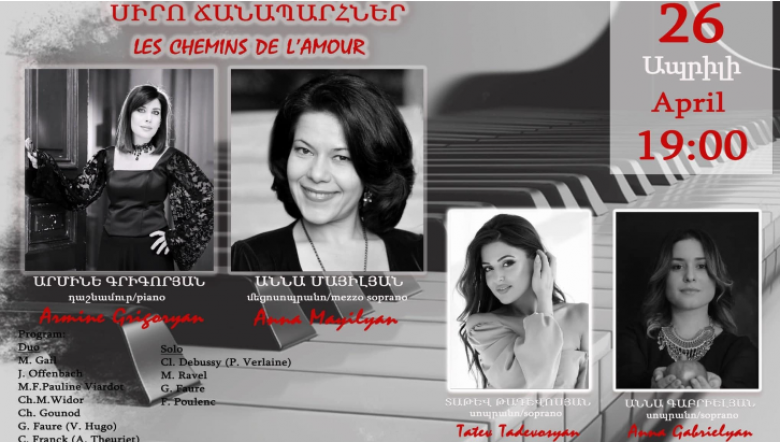 ՄշակույթՖրանկոֆոնիայի օրերի շրջանակներում ապրիլի 26-ին, ժամը՝ 19:00-ին Արամ Խաչատրյանի տուն-թանգարանը սիրով հրավիրում է իր հյուրընկալ համերգասրահ «Les chemins de l’amour / Սիրո ճանապարհներ» խորագրով համերգին: