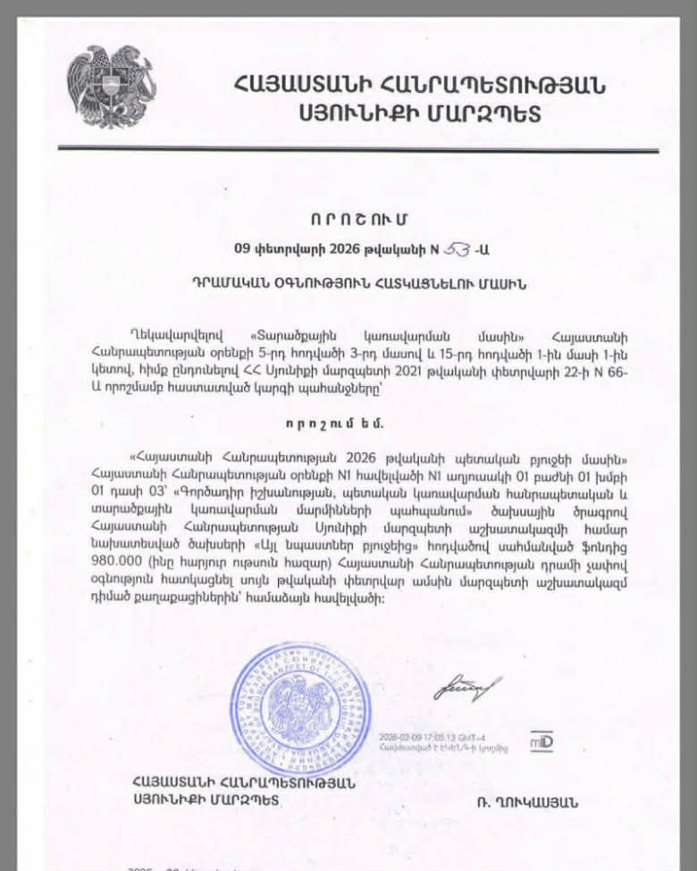 «Փաստ»-ի տեղեկություններով՝ փետրվարի 9-ին, այսինքն՝ Հանրապետության նախագահի կողմից ընտրություններ նշանակելու հրամանագրի ուժի մեջ մտնելուց ընդամենը երկու օր անց, Սյունիքի մարզպետը որոշում է ստորագրել մարզի բնակիչներին ֆինանսական աջակցություն տրամադրելու վերաբերյալ։ Ժամանակագրությունը ինքնին քաղաքական ենթատեքստ է ստեղծում, քանի որ խոսքը վերաբերում է արդեն պաշտոնապես մեկնարկած նախընտրական շրջանին։