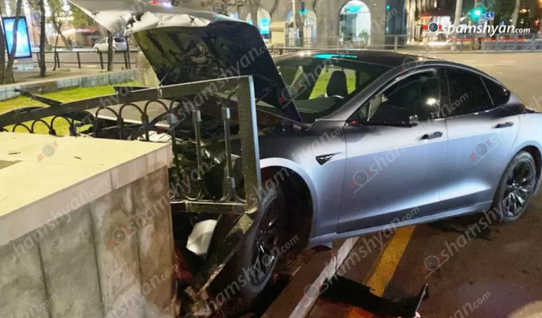 Երևանում «Tesla»-ն դուրս է եկել երթևեկելի գոտուց, անցել բազալտե եզրաքարի վրայով և կոտրել երկաթե պաշտպանիչ ցանկապատը․ վարորդը եղել է ոչ սթափ