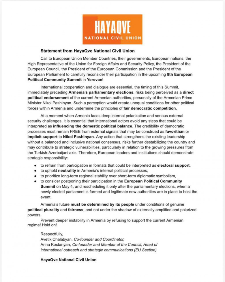 • «ՀայաՔվեի» հղած նամակ-կոչում ասվում է, որ միջազգային համագործակցությունն ու երկխոսությունը կարևոր են, սակայն այս գագաթնաժողովը, որն անմիջապես նախորդելու է հունիսին կայանալիք` Հայաստանի հերթական խորհրդարանական ընտրություններին, գործող իշխանություններին, անձնապես՝ ՀՀ վարչապետ Նիկոլ Փաշինյանին ՈՒՂԻՂ ՔԱՂԱՔԱԿԱՆ ԱՋԱԿՑՈՒԹՅԱՆ տարրեր է պարունակում։ Նման մոտեցումը կստեղծի անհավասար պայմաններ Հայաստանում գործող մյուս քաղաքական ուժերի համար և կխաթարի ԱՐԴԱՐ ԺՈՂՈՎՐԴԱՎԱՐԱԿԱՆ ՄՐՑԱԿՑՈՒԹՅԱՆ սկզբունքները։