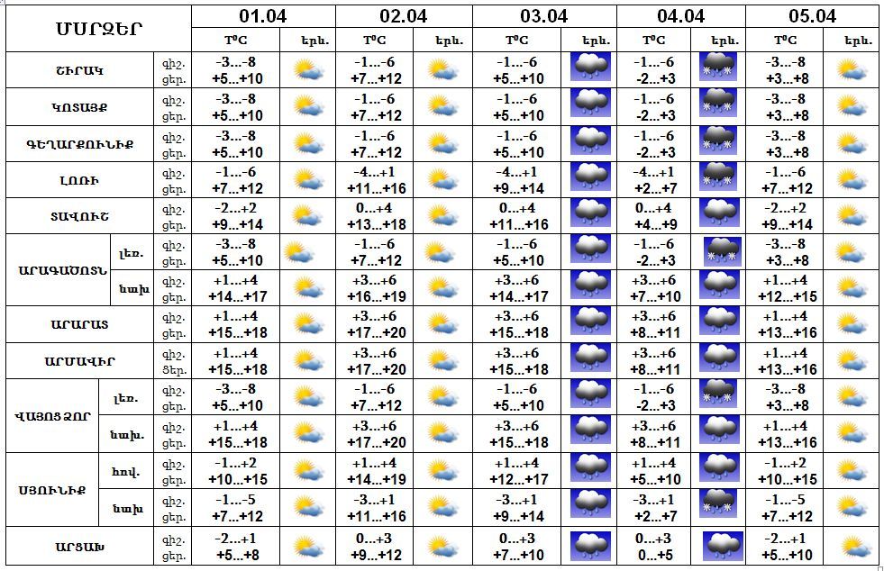 Օդի ջերմաստիճանը ապրիլի 2-ին կբարձրանա 2-3, արևելյան շրջաններում՝ 3-4, 3-ի ցերեկը կնվազի 2-3, 4-ի ցերեկը ևս 5-7 աստիճանով: