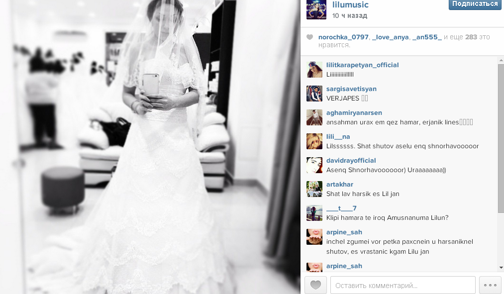 Երգչուհի Լիլուն իր միկրոբլոգում հարսանյաց զգեստով լուսանկար է հրապարակել։ Լուսանկարի տակ երկրպագուները շնորհավորական մաղթանքներ են թողել՝ կապված առաջիկա հարսանիքի հետ։ Դժվար է ասել՝ երգչուհին իսկապես ամուսնանալու է, թե սա պարզապես ապրիլմեկյան կատակ է: