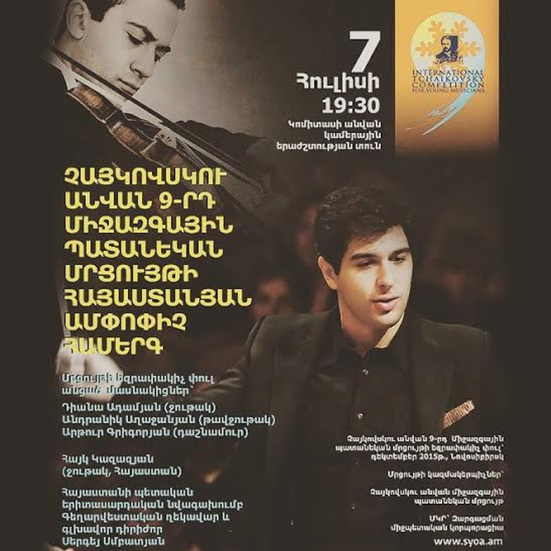 CultureՀուլիսի 7-ին կամերային երաժշտության տանը տեղի ունեցավ Չայկովսկու անվան 9-րդ միջազգային պատանեկան մրցույթի հայաստանյան ամփոփիչ համերգը: Համերգի կազմակերպիչն էր Հայաստանի պետական երիտասարդական նվագախումբը։ Մրցույթի կազմակերպիչները՝ Չայկովսկու անվան միջազգային մրցույթի դափնեկիրների ընկերակցությունը, Զարգացման միջպետական կորպորացիան։ Գլխավոր հովանավորը՝ ՄԿՌ Մեդիա Արմենիան: