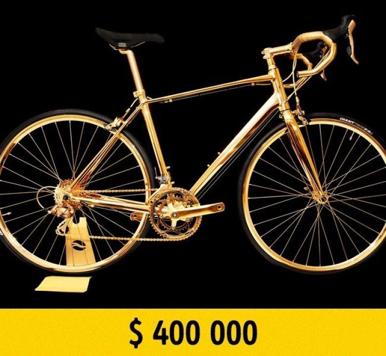 Велосипед, который полностью покрыт 24-каратным золотом, стоит всего $ 400 тыс. Кстати, седло обтянуто мягкой замшей, а сам велосипед украшен бриллиантами. Оставлять такую вещь во дворе — плохая идея, даже если у вас есть очень хороший замок на воротах.