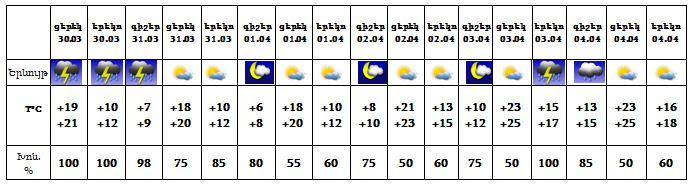Մարտի 30-ի ցերեկը, 31-ի գիշերը, ապրիլի 3-ի երեկոյան և 4-ի գիշերը ողջ հանրապետությունում, մարտի 31-ի ցերեկը, ապրիլի 4-ի ցերեկը Լոռիում, Տավուշում, Սյունիքում և Արցախում սպասվում է անձրև և ամպրոպ: Ապրիլի 1-2-ը, 3-ի գիշերը սպասվում է առանց տեղումների եղանակ: