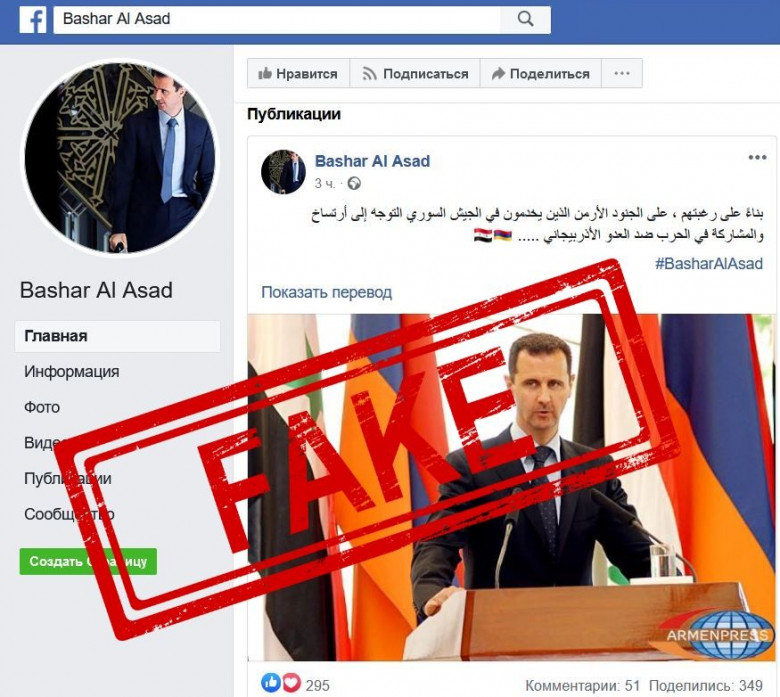 International newsՍիրիայի նախագահ Բաշար Ալ Ասադի անունից գործող ֆեյսբուքյան կեղծ էջը ապատեղեկատվություն է տարածել, թե իբր նախագահ Ասադը հայտարարել է, որ սիրիական զորքերը պատրաստ են մեկնել Արցախ և կռվել Ադրբեջանի դեմ։