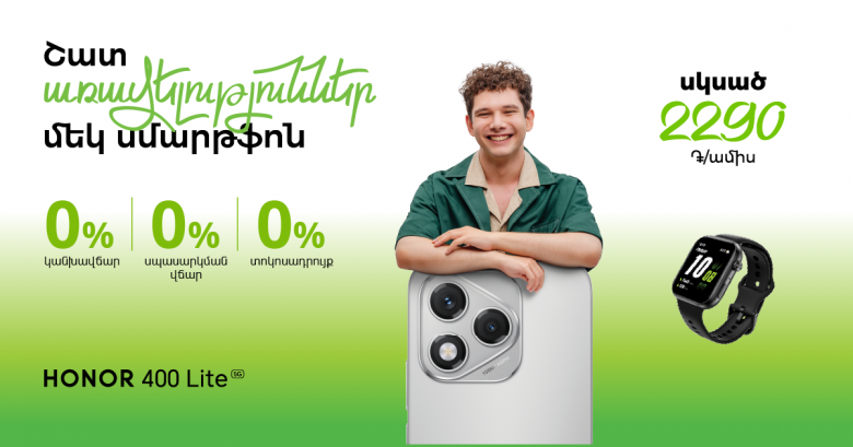 Exclusively at Ucom, this special offer includes a free branded HONOR Choice 2i smartwatch and 2 months of free service, including a premium phone number, on the Level Up+ 3000 plan for just 2,290 AMD per month with the purchase of each HONOR 400 Lite 5G smartphone.