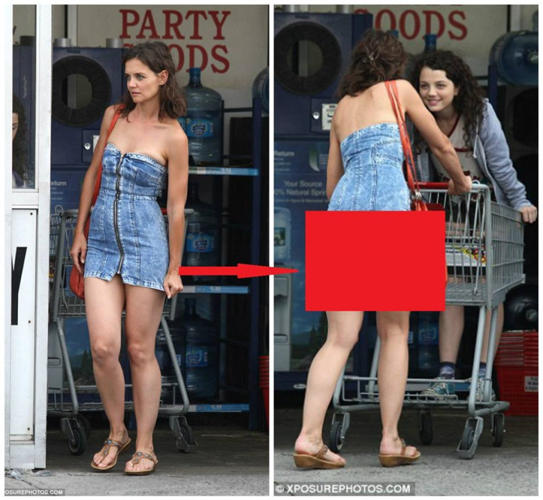 Не понятно о чем думала Кэти Холмс надевая такой короткий сарафан, если ей потом приходилось постоянно его одергивать, чтобы лишний раз не светить свою попу. Хотя в реальности все не так страшно, ведь это все был лишь образ для нового фильма.