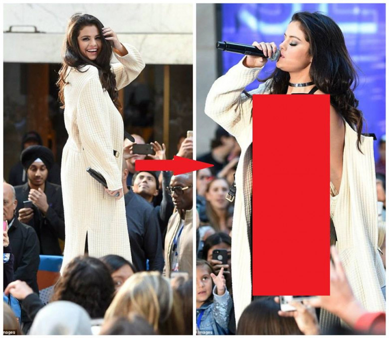 23-летняя певица была приглашена на Today Show телеканала NBC. На сцену Селена сначала вышла в сдержанном образе - вязаный кардиган скрывал все. Но потом во время исполнения своей песни "Same Old Love" она сняла кардиган и фанаты увидели ее в соблазнительном комбинезоне, который демонстрировал все прелести фигуры Селены.