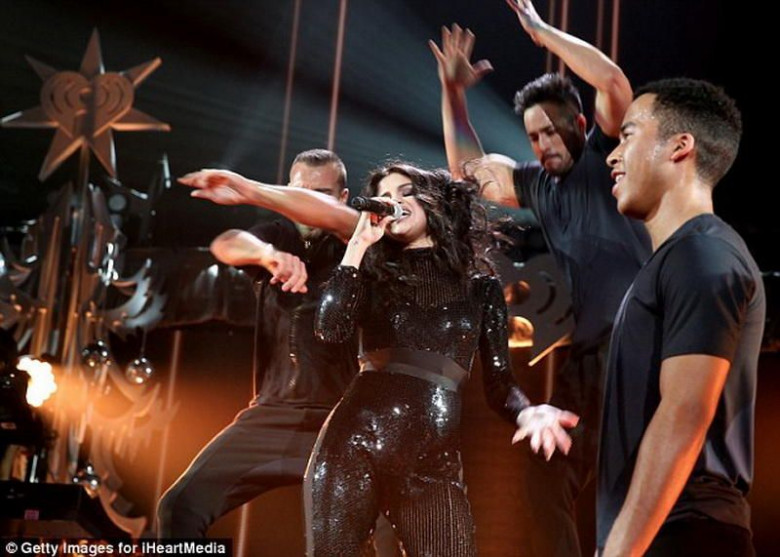 Селена, которая прибыла на шоу в скромном белом ансамбле, перевоплотилась, надев облегающее черное трико для выступления.