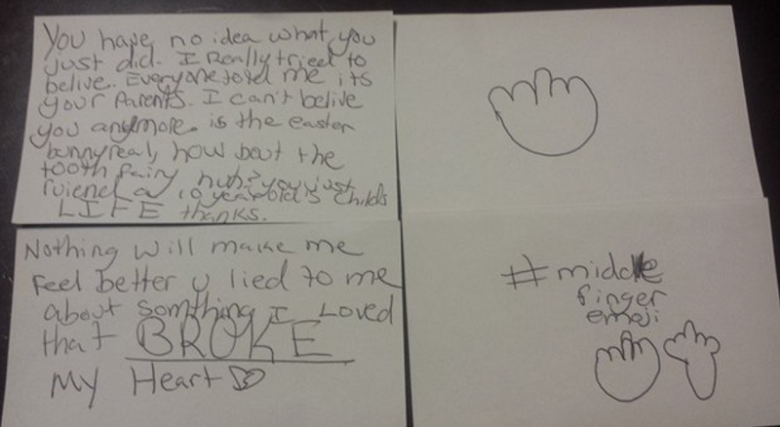 Эмоции захлестывают... А вот и перевод сего детского послания: «Да вы даже представить себе не можете, что вы натворили. Я правда верила в Санту... Я не могу больше вам верить. А пасхальный заяц существует? А как насчет зубной феи, а? Вы только что разрушили жизнь 10-летнего ребенка. Спасибо большое! Я больше никогда не буду прежней... Вы врали мне о том, что я любила. Это разбило мое сердце».