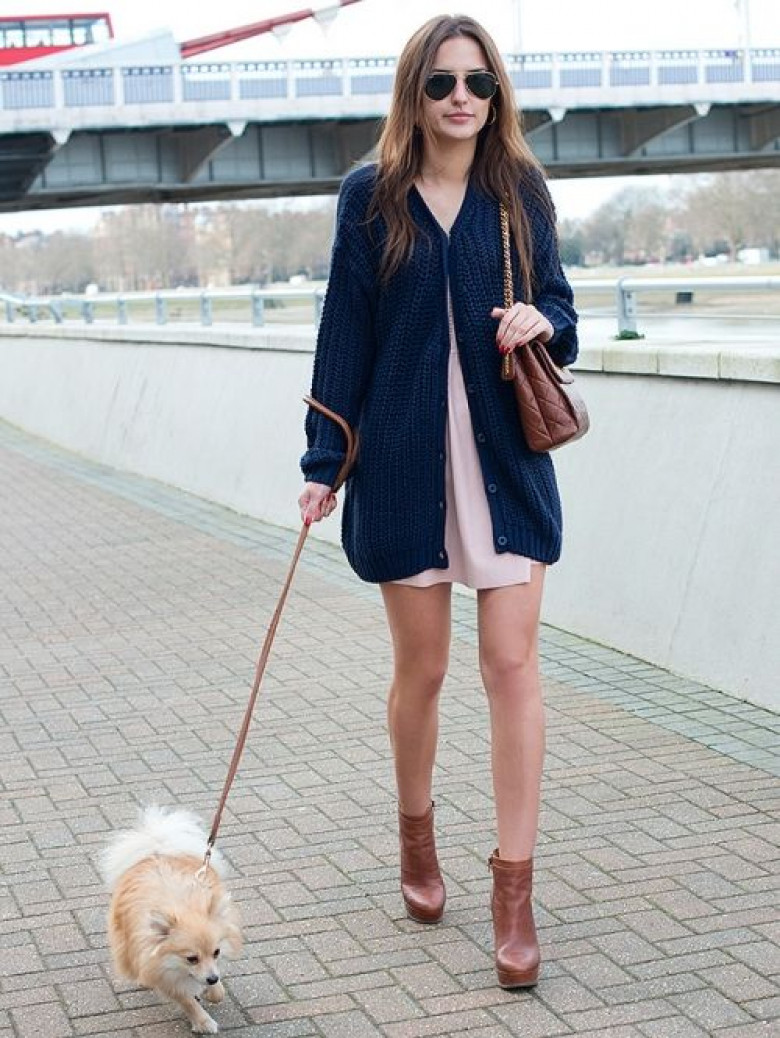 Самая простая комбинация, которая неизменно выглядит удачно — объемный свитер и узкие джинсы. Это действительно беспроигрышный вариант. Не менее удачна и игра с фактурами, например, большой кардиган крупной вязки носи с тонким шелковым платьем-комбинацией и нарочито грубыми сапогами-казаками.