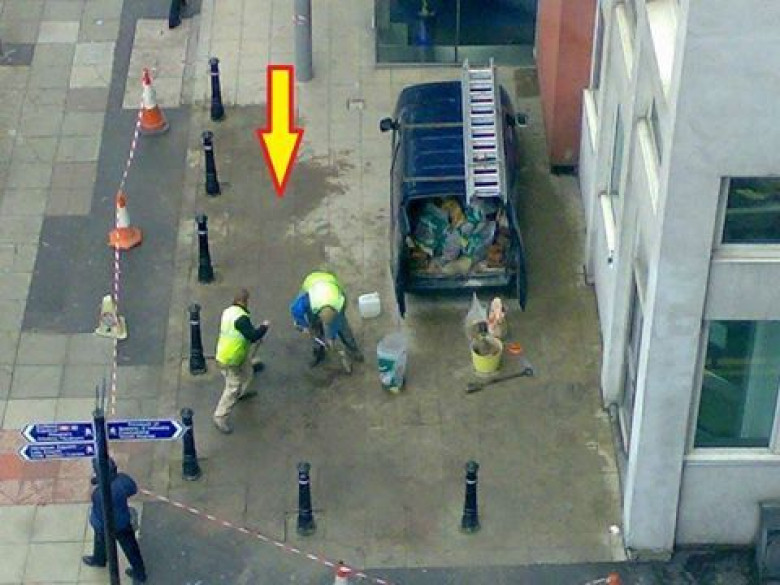 Казалось бы, вполне нормальный снимок. Работают себе люди, столбики бетонные устанавливают. Но, ко