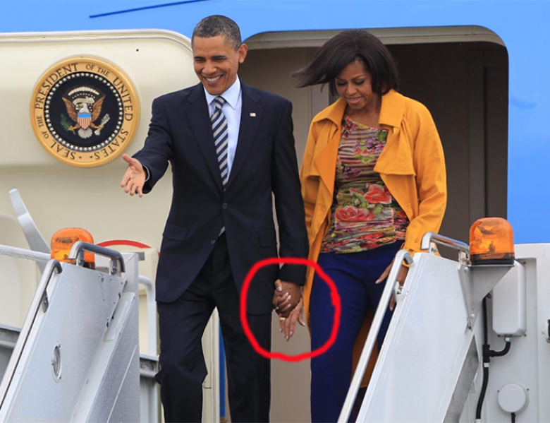 Кстати, это не первый случай, когда фоторедакторы заставляли Барака Обаму имитировать «рукопожатия». На этом снимке президент США должен держать за руку свою супругу Мишель. И все бы ничего, если бы не лишние пальцы.