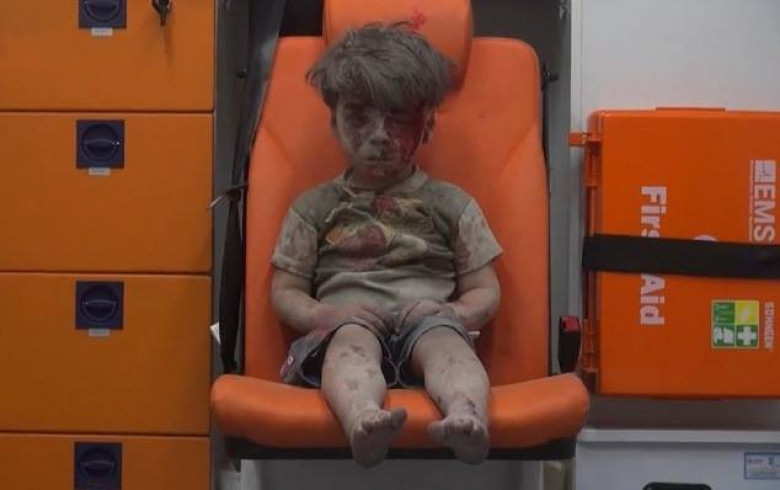 После авиаудара по жилым кварталам из под обломков разрушенного здания спасателям-добровольцам удалось вытащить 5-летнего мальчика, Омрана Дакниша. Его лицо было залито кровью, но при этом ребенок не выказывал никаких эмоций, отрешенно уставившись в пустоту...