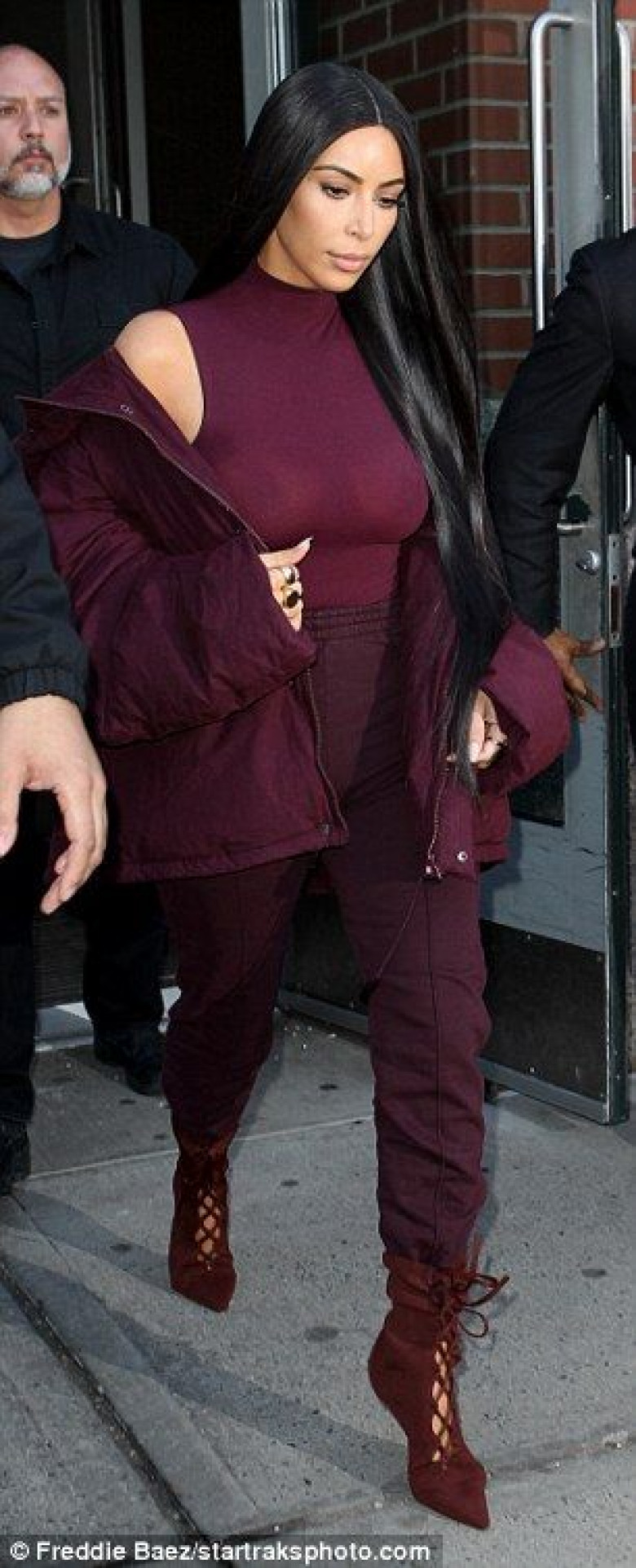 Многие заметили, что Кардашьян-средняя решила обойтись без бюстгальтера. Впрочем, Ким выглядела прекрасно — она выбрала фиолетовый облегающий топ, спортивные брюки в цвет и объемную куртку (разумеется, сшитые возлюбленным). Кстати, звезда реалити-шоу, а также ее младшая сестра Кайли Дженнер были единственными представителями клана Кардашьян-Дженнер, пришедшими на показ Канье Уэста.