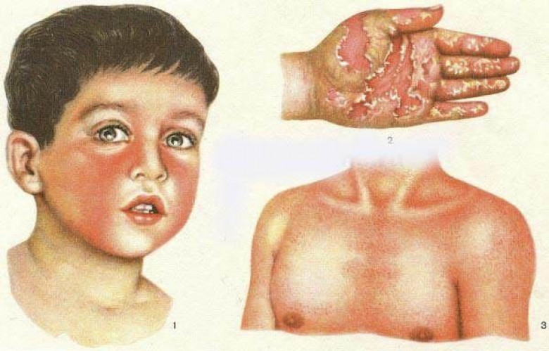 Возбудитель - стрептококк группы A (S. pyogenes), также вызывающий другие стрептококковые инфекции - ангины, хронические тонзиллиты, ревматизм, острый гломерулонефрит и другие. Заразиться можно через продукты питания, в общественном транспорте. Сначала резко поднимается температура, болит горло, появляются гнойнички во рту. Затем начинается мелкая, зудящая сыпь, которая за несколько часов покрывает практически все тело. Важный признак скарлатины — сгущение сыпи в виде темно-красных полос на кожных складках в местах естественных сгибов — в паховых складках, подмышечных впадинах, локтевых сгибах. На ощупь кожа очень сухая и напоминает наждачную бумагу. Через 3-5 дней кожа бледнеет и начинается сильное шелушение, особенно выраженное на ладошках ребенка: кожа с них снимается как перчатки.
