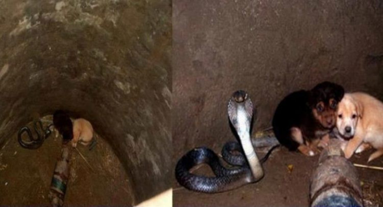 Их взволнованная мама подняла лай, на который сбежались люди. Заглянув внутрь колодца, они увидели страшную картину: к щенкам подползла королевская кобра. Каково же было всеобщее удивление, когда оказалось, что рептилия не только не наносит никакого вреда щеночка, но и всячески о них заботится!