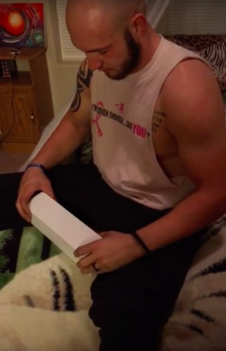 Глядя на размер подарка, мужчина предполагает, что там часы. Но стоило ему открыть коробку, как всё стало ясно.