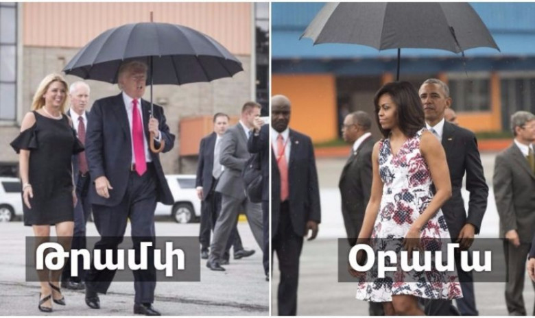 Եվս մի նմանատիպ լուսանկար։ Բացի կնոջից՝ Թրամփը համառորեն ոչ ոքի թույլ չի տալիս իր անձրևանոցով ծածկվել։trump and obama