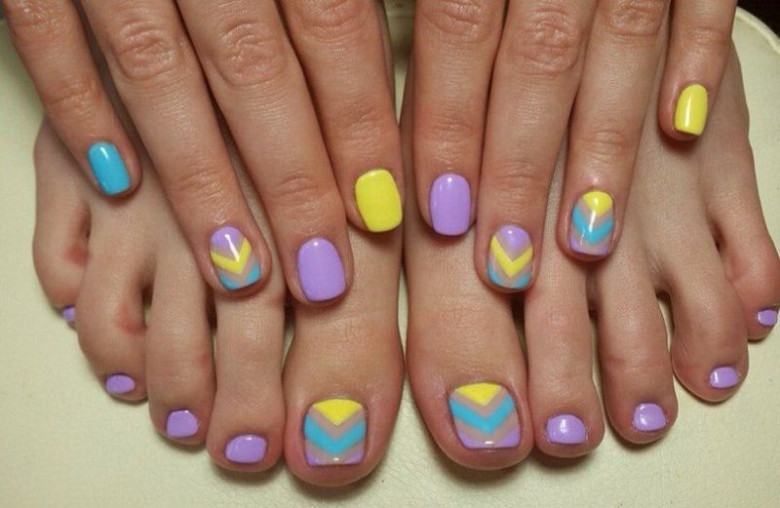 14. Разноцветные ноготки будут поднимать тебе настроение каждый день. Главный совет — если в маникюре буйство цветов, то педикюр следует делать спокойным.