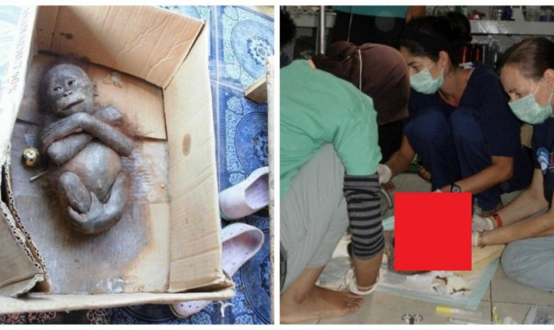 Жестокие хозяева запихнули больного орангутанга в коробку и выбросили вон. Вот каким нашли его спасатели…