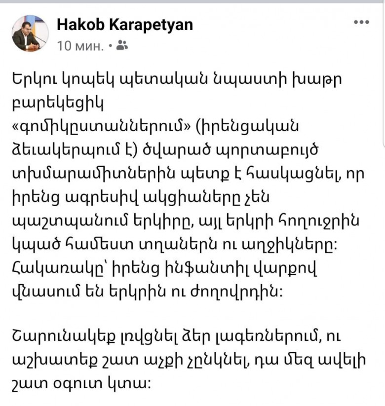 ПолитикаԵրեւանի քաղաքապետի մամուլի քարտուղար Հակոբ Կարապետյանը երեկ ֆեյսբուքյան իր էջէում Սփյուռքի մեր հայրենակիցներին անվանել է, խնդրում եմ ուշադրություն, հիմա ուղիղ մեջբերում Հակոբի տեքստից՝ երկու կոպեկ պետական նպաստի խաթեր գոմիկըստաններում ծվարած պորտաբույծ տխմարամիտներ, որոնց ակցիաները չեն օգնում մեր երկրին, այլ հակառակը՝ իրենց ինֆանտիլ վարքով վնասում են երկիրն ու ժողովրդին։ Սա, մի ագնամ էլ հիշեցնեմ, ասել է քաղաքապետ Հայկ Մարությանի մամուլի քարտուղարը։ Այուհետեւ, մամուլի քարտուղարը շարոկնակում է իր միտքը՝ Շարունակեք լռվցնել ձեր լագեռներում ու աշխատեք շատ աչքի չընկնել, դա մեզ շատ ավելի օգուտ կտա։