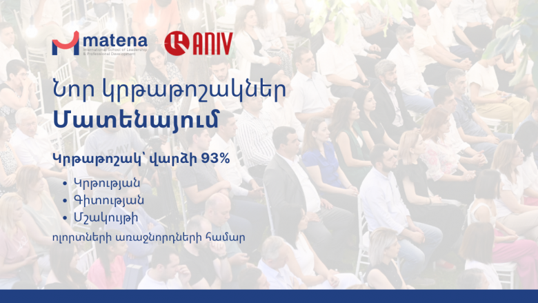 Общество“Aniv” foundation for Development and Support of Armenian Studies has started cooperation with "Matena" International School of Leadership & Professional Development. Leaders in the fields of education, science and culture can apply for the “Leading People and Teams” and “Strategic Planning and Business Development” programs starting in May and receive huge scholarships paying only 7% of the tuition fee. The remaining 93% “Aniv” foundation will provide as a scholarship.