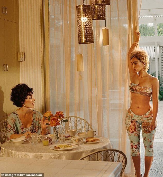 В финальной части кампании Ким и Крис позируют на кухне в ретро-стиле. Кардашьян — в топе-бандо и облегающих капри с ярким летним принтом, а её мама — в костюме с тем же узором. На коротком видео Ким берет кусочек тоста и продолжает перекус на фоне открытой двери.