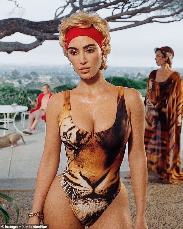 На снимках Ким практически неузнаваема — вместо привычных тёмных локонов она предстала с коротким кудрявым блонд-бобом. В одном из образов Кардашьян позирует в слитном купальнике с тигровым принтом и глубоким вырезом. Образ дополнили широкая красная повязка на голову, золотые серьги и массивный браслет.