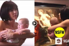 Կինն ամբողջությամբ մերկ՝ երեխան գրկին, քայլում է թանգարանում՝ ուսումնասիրելով ար...