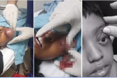 Բժիշկը երեխայի դեմքից հեռացնում է հսկայական կիստա, որն այնքան էր մեծացել, որ փակ...
