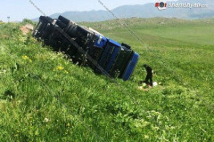 Արագածոտնում 30-ամյա վարորդը ապակե տարաներով բարձված բեռնատարով շրջվել է (ֆոտո)