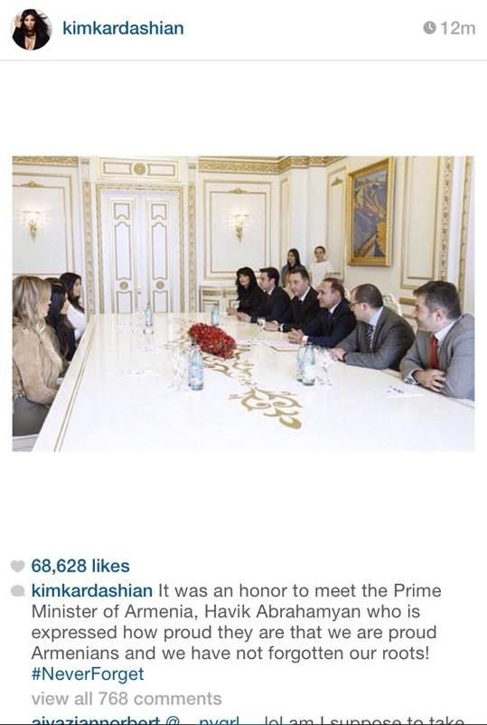 ԲլոգՔիմ Քարդաշյանը ինստագրամի իր էջում անդրադարձել է վարչապետ Հովիկ Աբրահամյանի հետ հանդիպմանը. «Պատիվ էր հանդիպել Հայաստանի վարչապետ Հովիկ Աբրահամյանի հետ, ով նշեց, թե որքան հպարտ է, որ մենք հպարտ հայեր ենք և չենք մոռացել մեր արմատները»,-գրել է նա՝ ավելացնելով #NeverForget հեշթեգը:»: