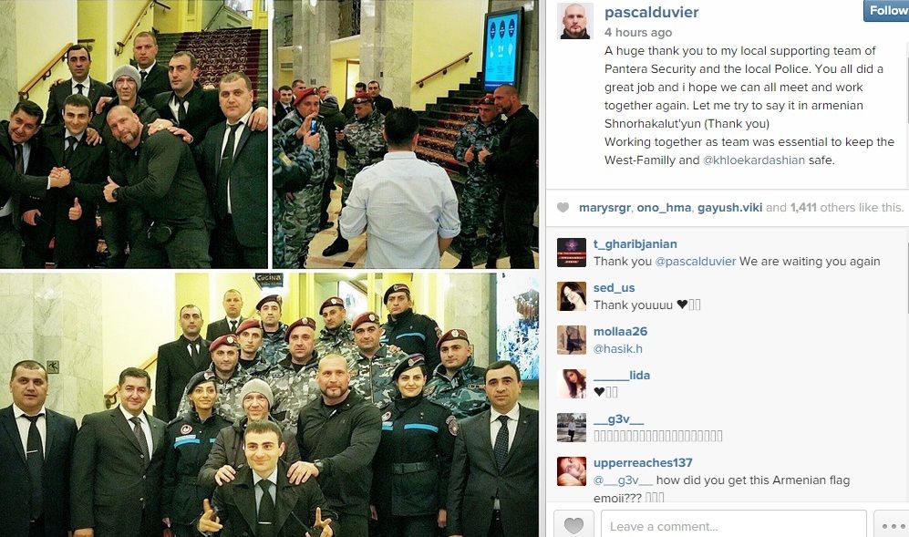 ԲլոգՔիմ Քարդաշյանի հետ Հայաստան ժամանած թիկնապահը՝ Փասկալ Դուվիերը, ով Instagram-ի իր էջում պարբերաբար լուսանկարներ էր տեղադրում և մեկնաբանություններ անում այցի մասին, գրել է.