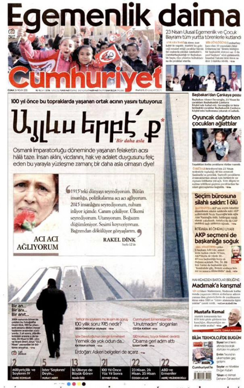 Այսօր Թուրքիայում մի շարք օրաթերթեր լույս են տեսել Հայերեն լեզվով:Cumhuriyet, Özgür Gündem ,Azadiya Qelat թերթերը լույս են տեսել Հայերենով և տպագրել են Հայոց ցեղասպանությանը վերաբերող նյութեր և նկարներ:Հոդվածներում նկարագրել են Հյաերի կոտորածը 1915թ-ին և հանդես եկել թուրքական կառավարությանը սեփական պատմության հետ առերեսվելու կոչերով: