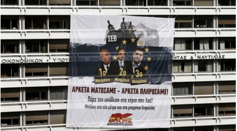 Շուրջ 150 մարդ ներխուժել Է ֆինանսների նախարարության շենք, որը գտնվում Է Աթենքի կենտրոնի Սինտագմա հրապարակում, բարձրացել շենքի տանիք եւ կախել հսկայական ցուցապաստառ՝ նախկին վարչապետներ Պապանդրեուի, Սամարասի եւ կառավարության ներկայիս ղեկավար Ցիպրասի դիմանկարներով եւ «Բավ Է արյուն հեղենք ու վճարենք: Ժողովուրդ՝ գործելու ժամանակն Է: Կանգնեցնել նոր միջոցներն ու հուշագրերի շարունակումը» մակագրությամբ: